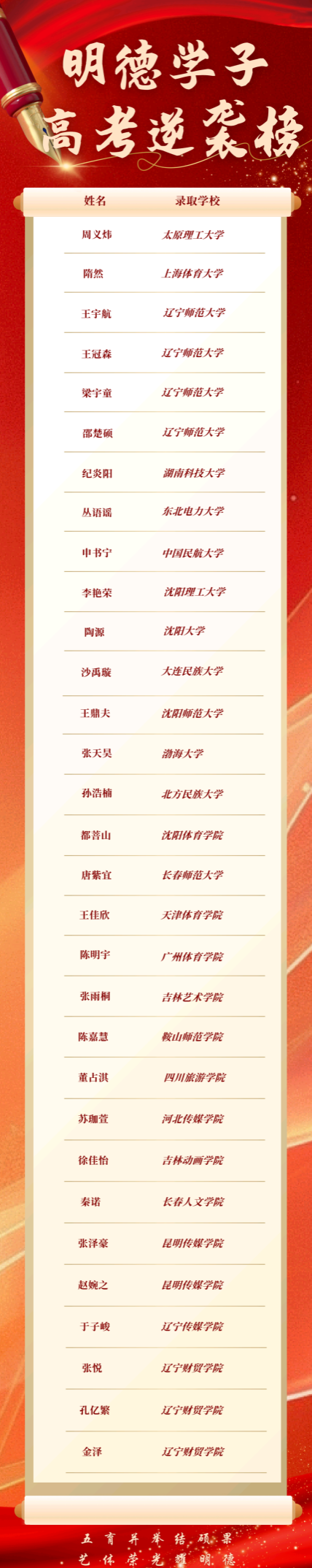 曾经的成绩从不是终点,而是你蓄力奔跑的起点。那些默默追赶的日夜,终将在高考的赛场上绽放光芒——祝贺你用坚持改写了轨迹,用努力证明了“后来者亦可居上”!未来的路,带着这份逆袭的勇气继续向前,前方定有更广阔的天地在等你!明德永远是你们坚强后盾!