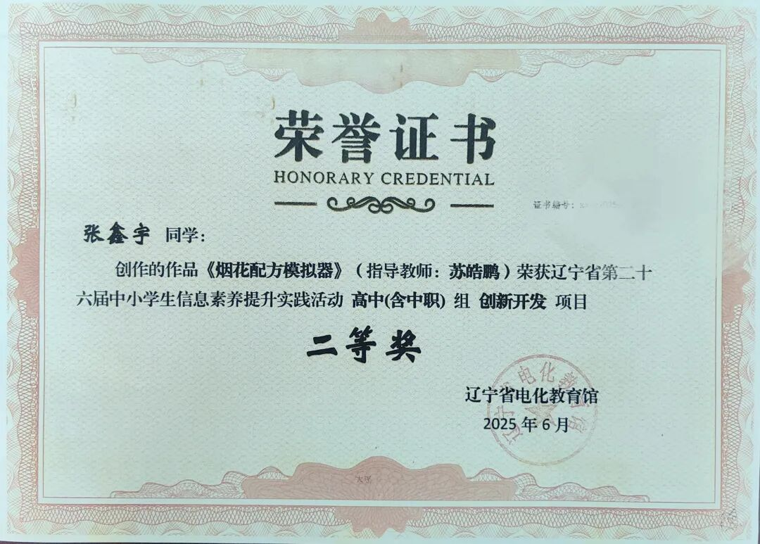 我校高二1班 张鑫宇 同学创作的作品《烟花配方模拟器》(指导教师:苏皓鹏)荣获辽宁省第二十六届中小学生信息素养提升实践活动高中组创新开发项目