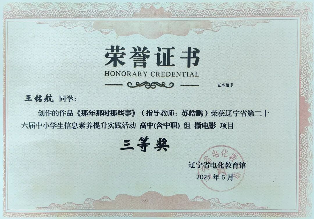 我校高三2班王铭航同学制作的作品《那年那时那些事》(指导教师:苏皓鹏),荣获大连市2025年中小学生信息素养提升实践活动高中组微电影项目